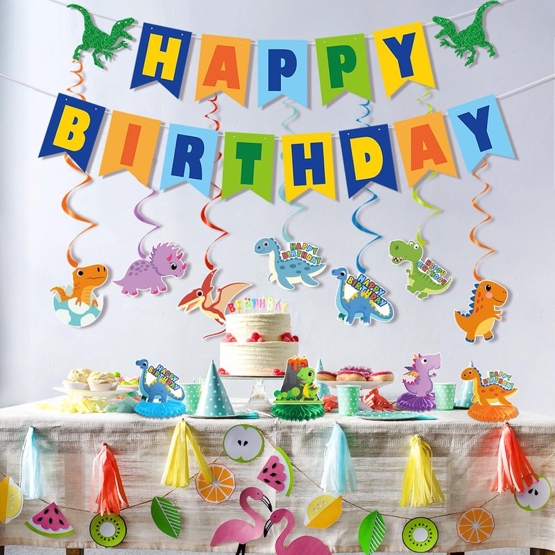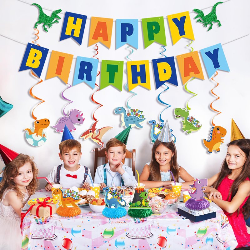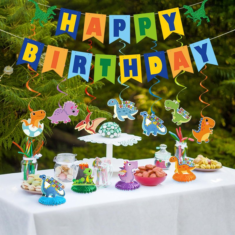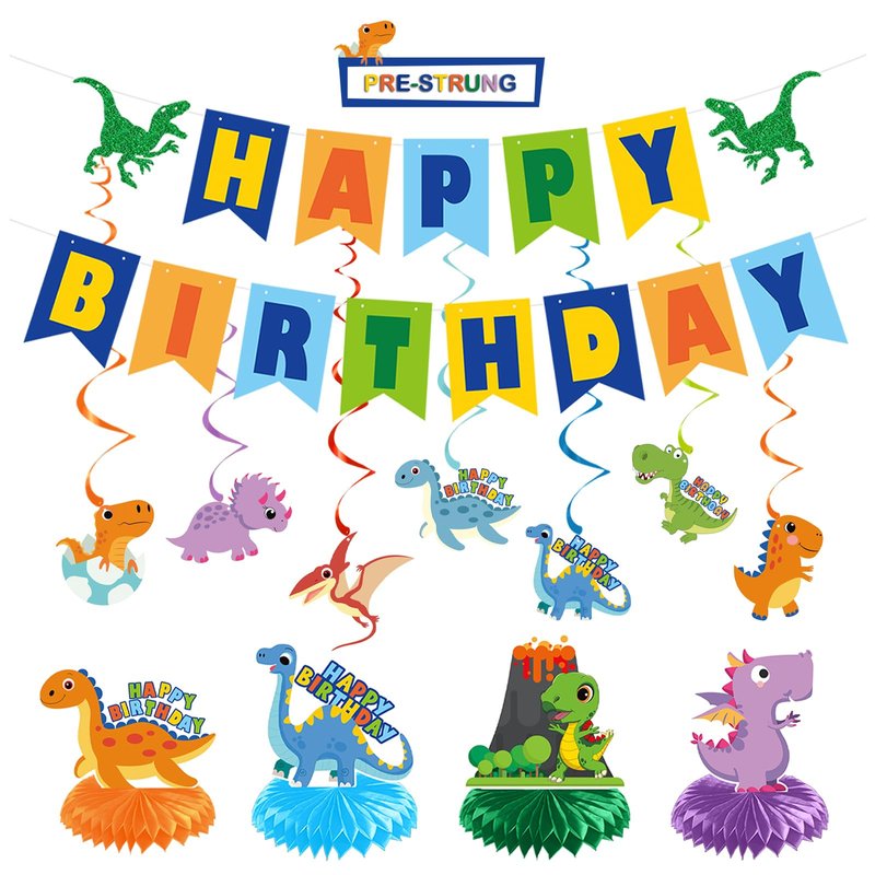 - 🎈 PRE-STRUNG, USER-FRIENDLY DESIGN | COMPLETE SET : The kit includes a set "Happy Birthday" banner, 7 playful cute dinosaur birthday hanging swirls, and 4 charming dino birthday honeycomb centerpieces. It’s an all-in-one set, pre-assembled for your convenience.
