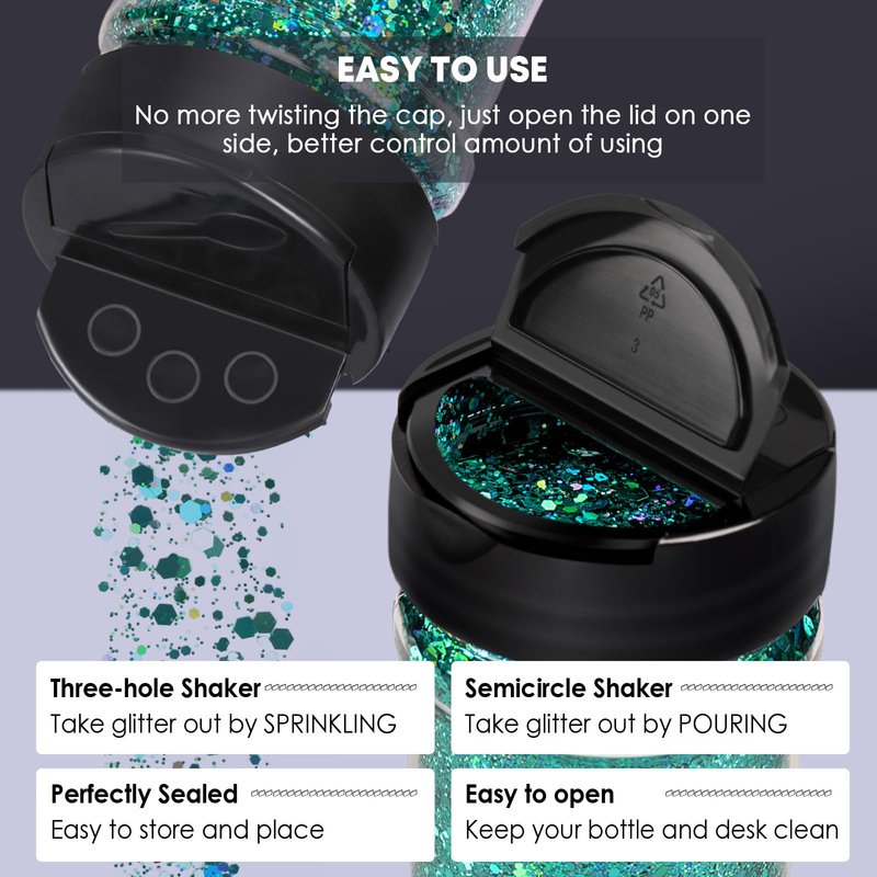 - 【Perfectly Sealed & Shaker Cap】Holographic chunky glitter for resin features this thoughtful cap with two different diameters. This shaker cap is perfectly sealed and can help control the flow of peacock blue glitters. no more twisting the cap, just open the lid on one side according to your needs. So, the integrity of the product can be guaranteed, and there will be less waste.