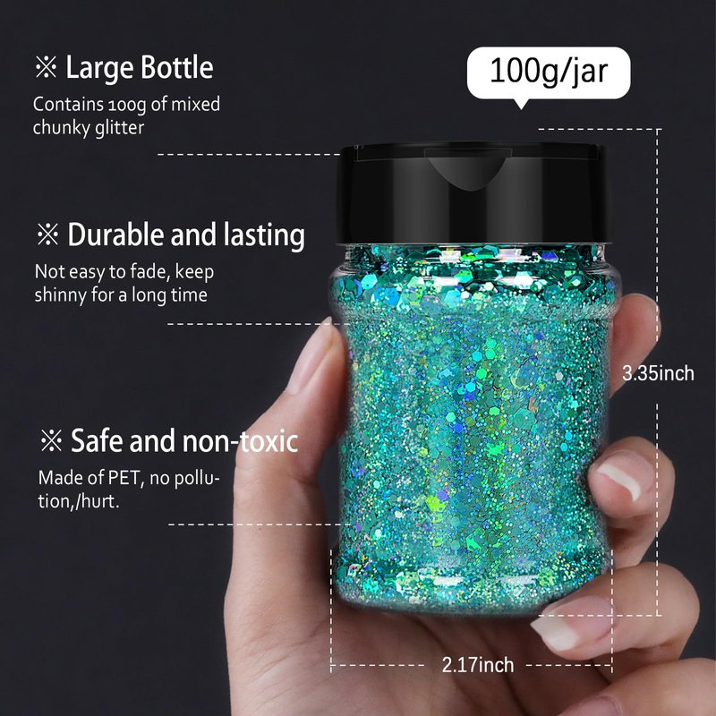 - 【Large Bottle for Wide Usage】100g/jar(2.17*3.35inch), this chunky glitter for resin is suitable for long-time use. Meanwhile, our excellent chunky glitter displays high compatibility with resin, tumblers, nails, decor, painting, scrapbooking, jewelry, school projects, etc. This holographic glitter chunky works well with glue and epoxy to make sparkle crafts, which let your artworks stand out beautifully!