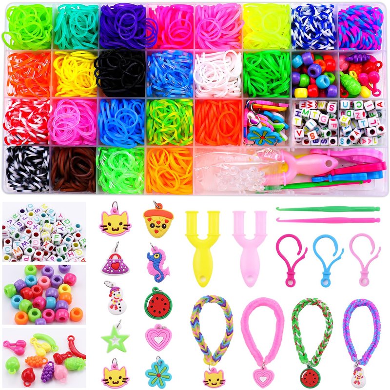 - 💡【PORTABLE RUBBERBAND BRACELETS KIT】It is a lightweight portable rubber band bracelet making kit. The loom rubber bands and all tools are stored neatly in a see-through plastic 29 Grids Box to keep them organized for being creative at home or on the go. Also, our rubber bands bracelet kit adopts a Cardboard Packaging Box, which can ensure that the rainbow colors loom bands kit is break-free during transportation.