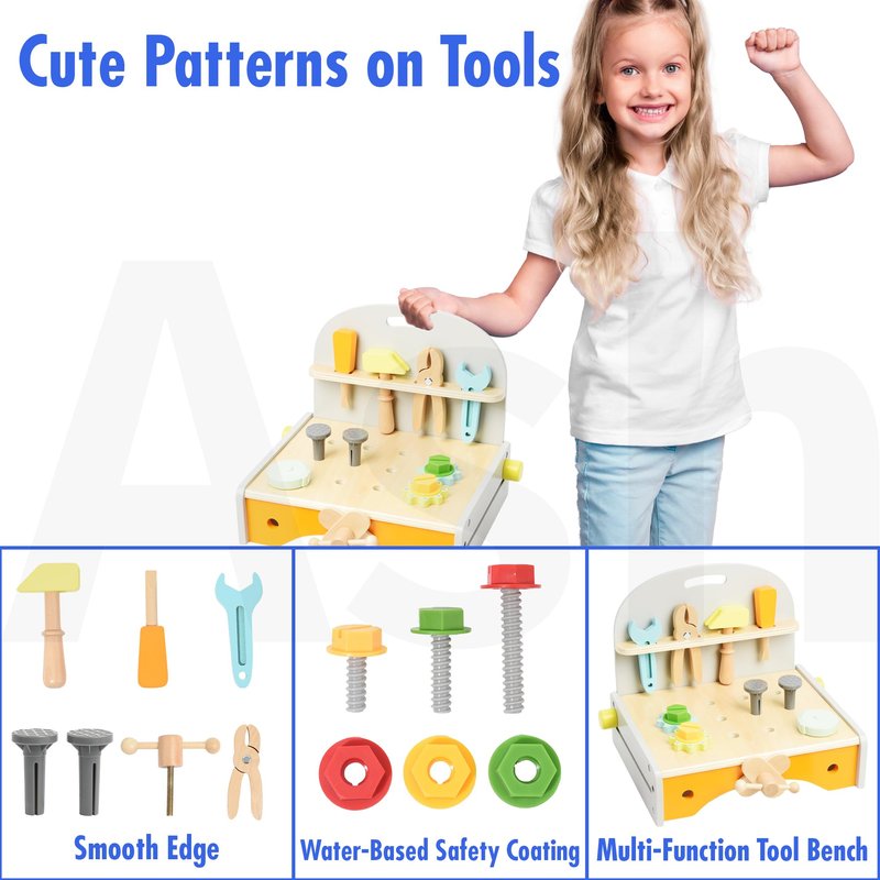 - Durable & Safe: Made of high quality PP plastic and smooth wood materials, our toddler wooden tool set ensures a safe and durable play experience for your child. During hands-on exploration, rounded corners and a child-friendly design prioritized safety.