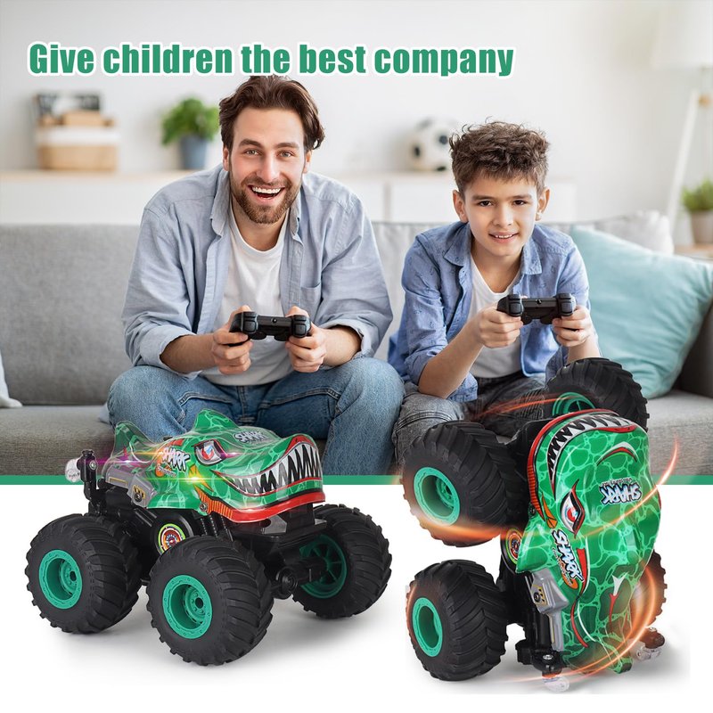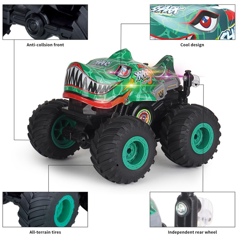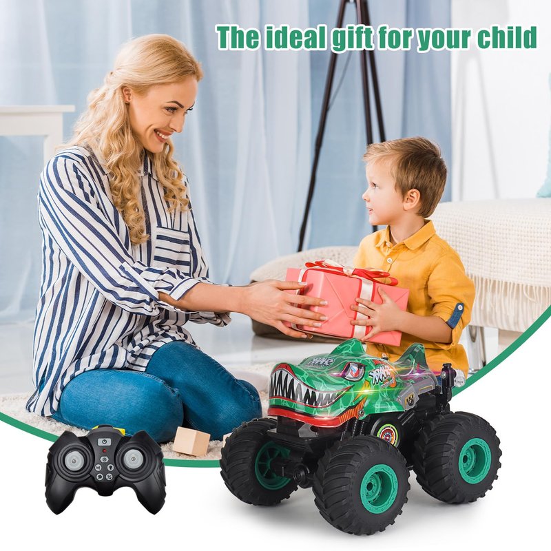 - RC Dinosaur Truck for Kids - This RC monster truck has a variety of features that kids can play with, just use the 3 different lighting modes - from fast and intense flashing to slow and steady pulsing, and even continuous lighting to bring it to life. The RC Monster Truck can also play music through its built-in speakers, so all you have to do is toggle the music on and off with the controller. Long press the music button and the truck will automatically dance.