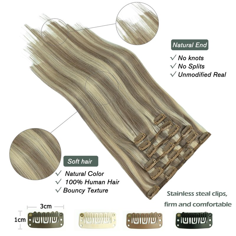 HUAYI Clip in Hair Extensions,Double Weft Ash Blonde Mix With Bleach Blonde Brazilian Hair,Remy real Human Hair(22In 7pcs 70g)