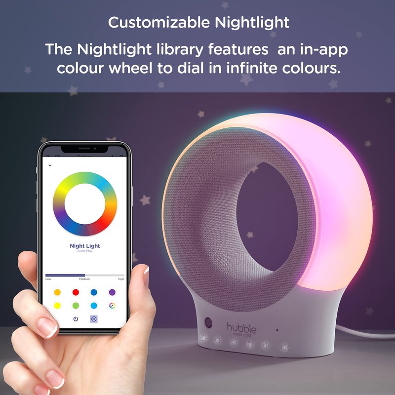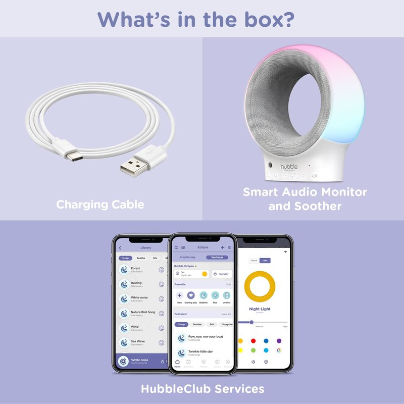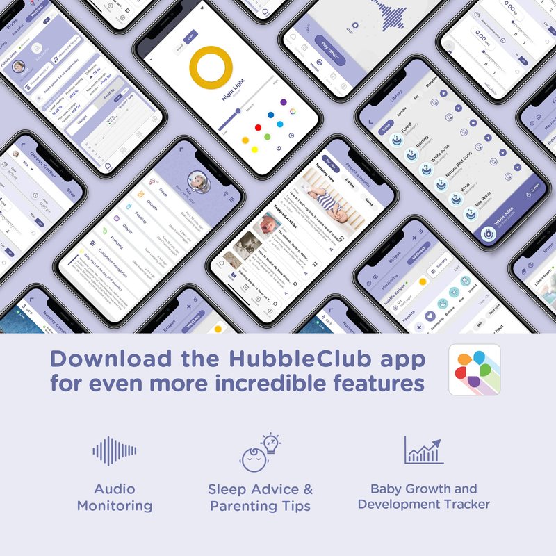 - HUBBLE CLUB APP COMPATIBLE: Get expert sleep advice and control the preloaded lullabies and relaxing sounds through the free HubbleClub app. Personalize your nightlight color and use the Hubble baby monitor as a music player for your own tunes!