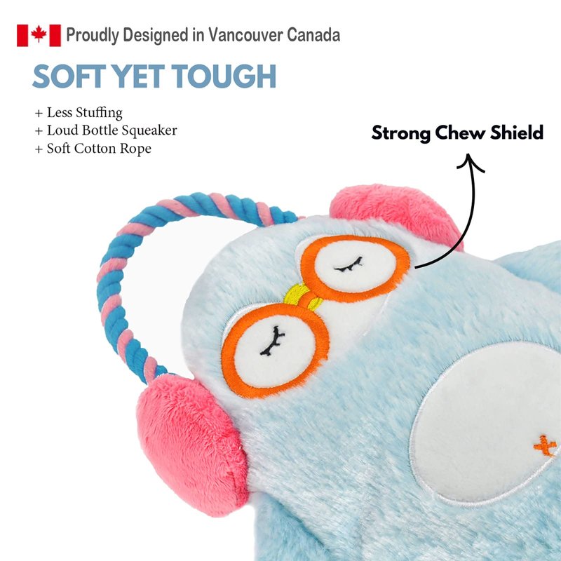 Melody bros are designed for dogs who love loud squeakers. Non-abrasive cotton rope and soft plush satisfy a dog’s instinct to play. Containing two large bottle squeakers inside the belly, which brings mess-free. Now, taking your pooch into a wonderful musical journey!