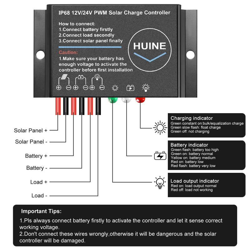 HUINE 20A 12V 24V Auto IP68 Waterproof PWM Solar Charge Controller Solar Panel Battery Intelligent Regulator for Solar System Caravan Boat(24 Hours Working Mode)