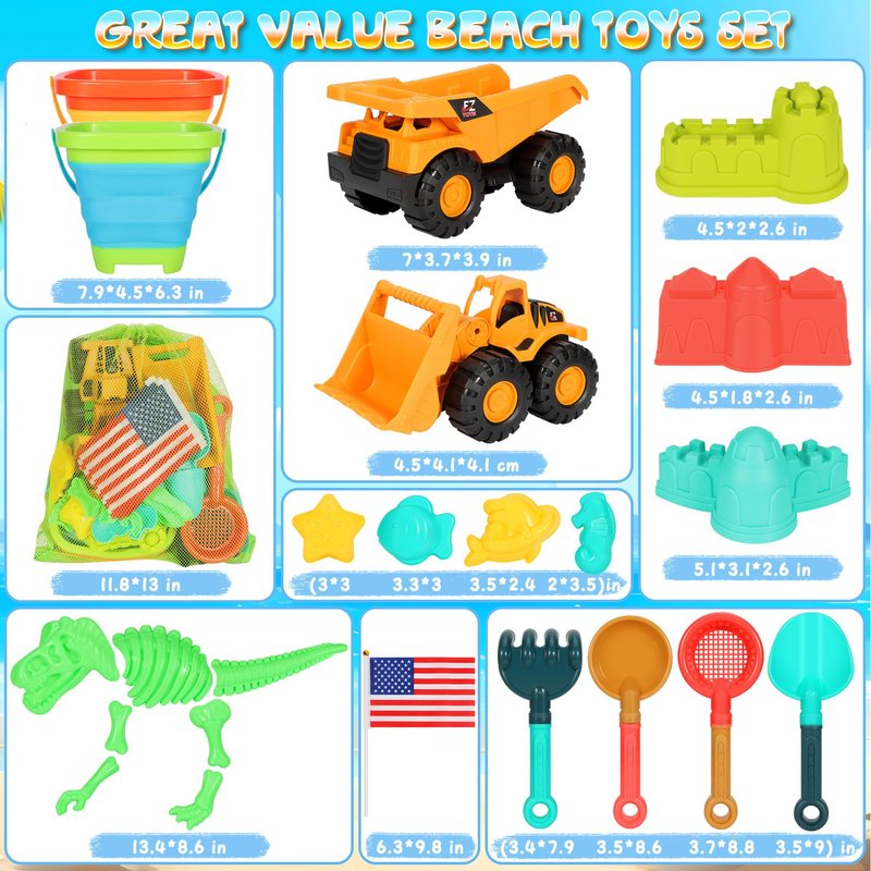 - 🚜【 2PCS Construction Vehicle Toys & Various Sand Molds 】Bring our beach excavator toy car and let the kids dig and explore on the beach! Use beach sandcastle models create castle buildings with different shapes,ocean sand models to create a beach world, build a mini dinosaur world with dinosaur fossil molds. Kids can give their imagination into full play to create their own castles for summer beach fun! What's more, we add 6 pcs little flags to increasing their engagement and enjoyment.