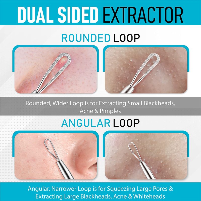 - 【Dual Sided Blackhead Remover】With a thin loop on one end (for removing larger blackheads, whiteheads and acne), and a thick loop on the other end (for removing smaller imperfections), this extractor is as versatile as they come. Regardless of age or gender, this is one timeless, multifaceted tool that everyone will want to have in their beauty arsenal!