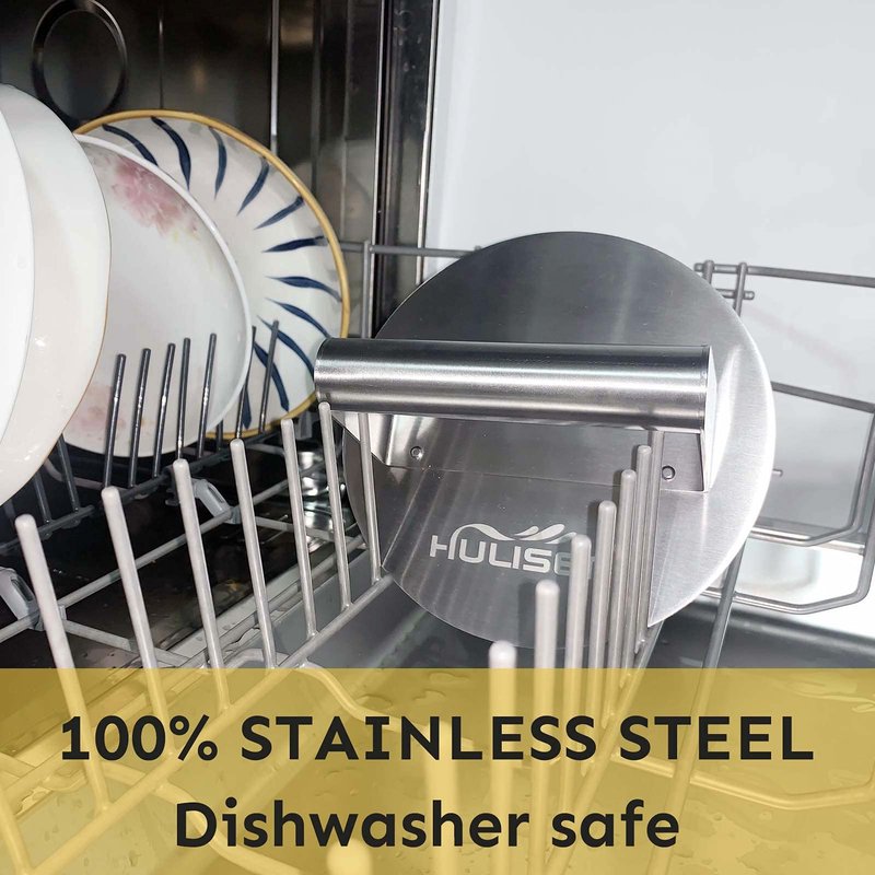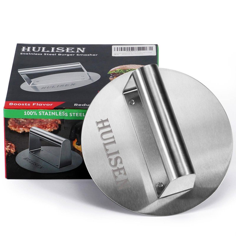 HULISEN Stainless Steel Burger Press, Round Burger Smasher, Grill Press Hamburger Patty Press. Smashing perfectly nice, thin, crispy burgers on your griddle with ease. With sturdy stainless steel construction, the Griddle Smashed Burger Press helps you effortlessly create mouthwatering burgers with sealed in flavor. Specially designed for griddled smashed burgers. Dishwasher safe for easy cleanup. Smooth surface prevents your burger from sticking, for an easier clean, more efficient cleanup after every use.