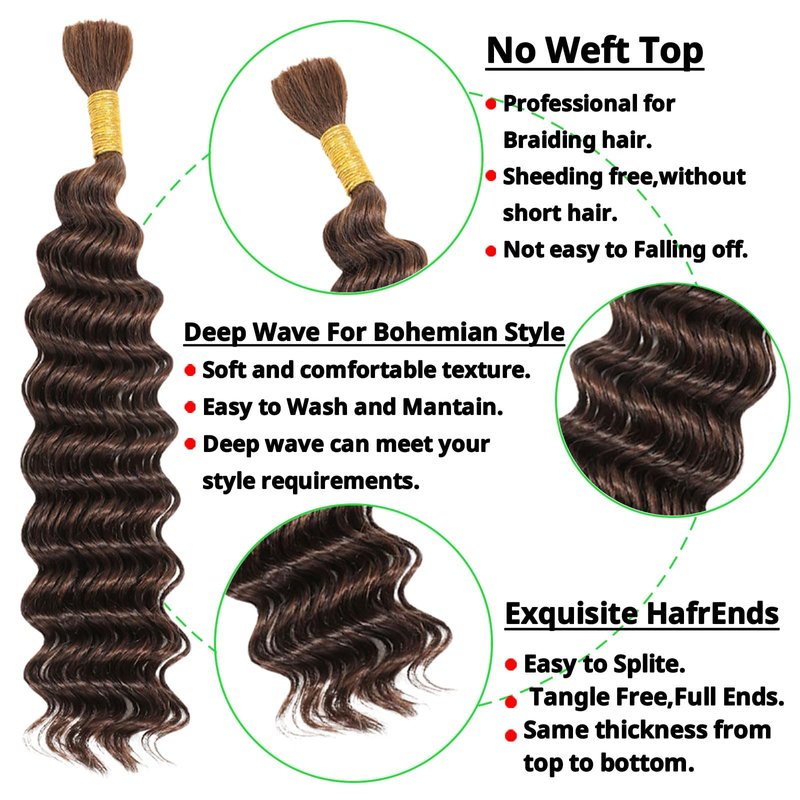 - 1. Hair Material: Deep wave Bulk Human Hair for Micro Braiding No Weft is made with 100% Raw and Unprocessed 12A Brazilian Virgin Human Hair. Cut off from one Young Donor Directly. Full Cuticle Intact and Aligned in the same direction.It's clean and soft, natural and healthy, bouncy and glossy, full and thick.