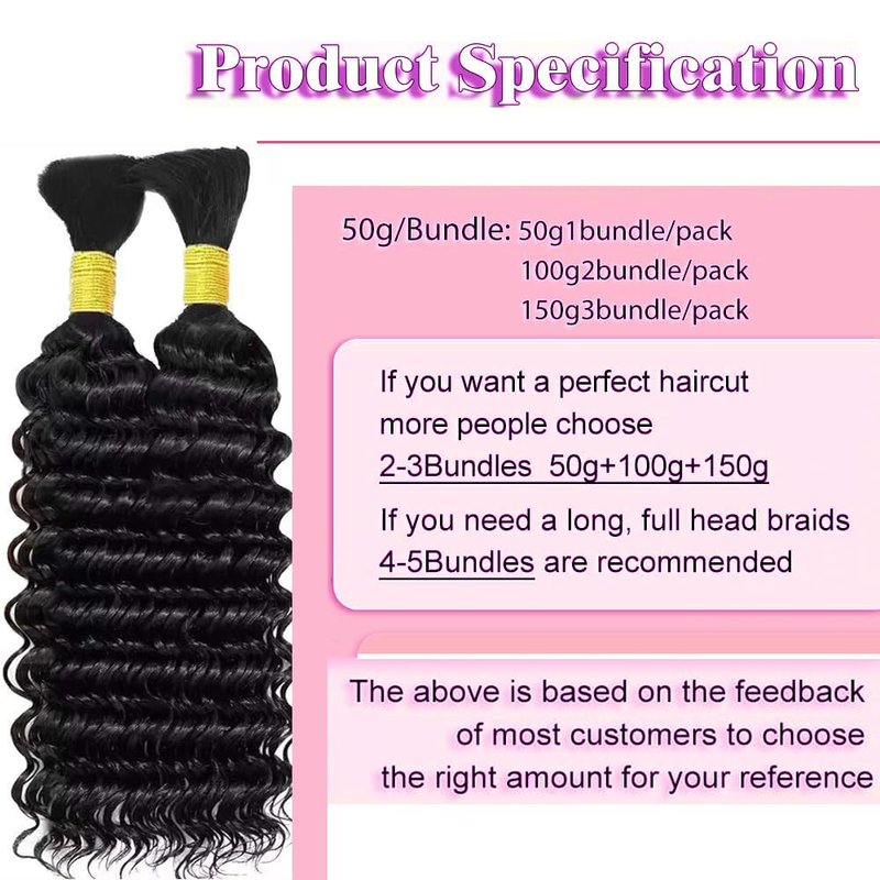 - Human braiding hair:Deep wave Bulk Human Hair for Micro Braiding No Weft is made with 100% Raw and Unprocessed 12A Brazilian Virgin Human Hair. Cut off from one Young Donor Directly. Full Cuticle Intact and Aligned in the same direction.It's clean and soft, natural and healthy, bouncy and glossy, full and thick.