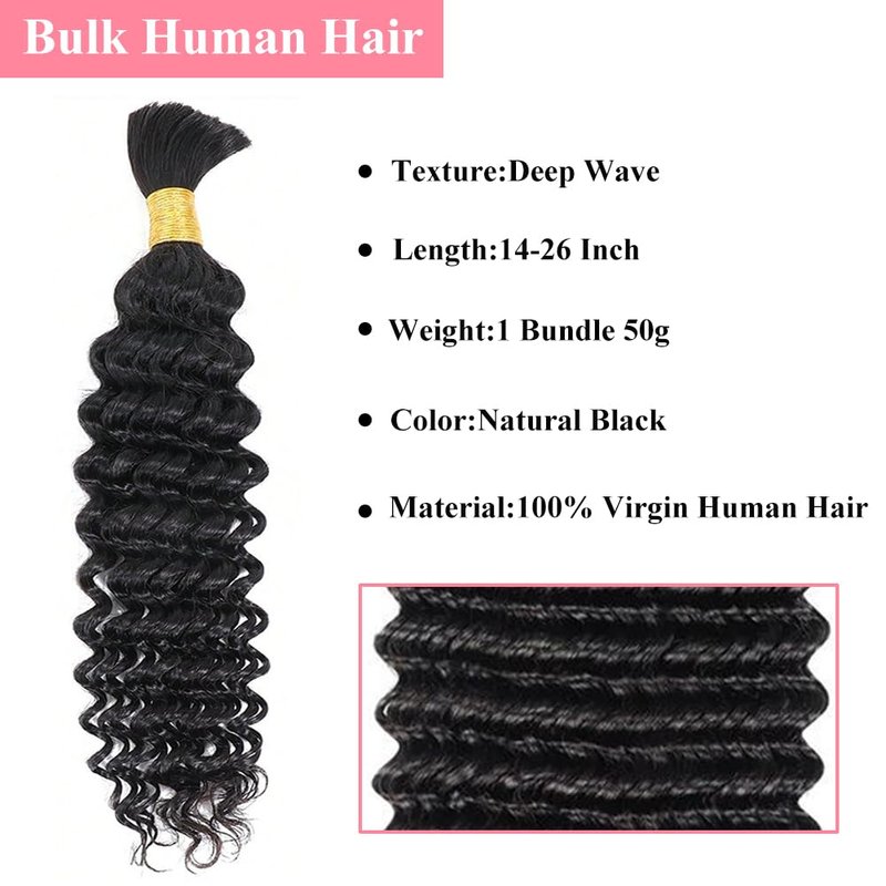 - About Length & Weight:The deep wave bulk human hair for braiding wet and wavy braiding hair length is 14-26 inches (Tips: Please straighten the hair to measure).This is single bundle 50g.Generally speaking,50g is not enough if you want to create a bushy hairstyle.More people choose to order 100g+50g in order to be able to make a more perfect hairstyle.