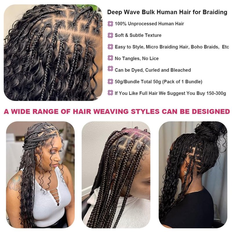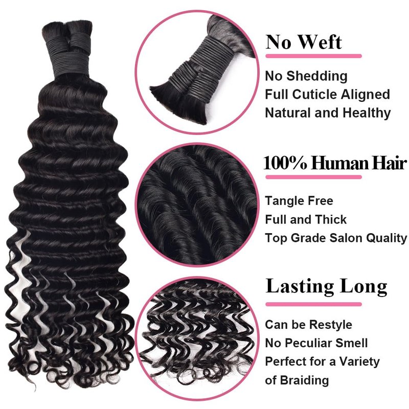 - 【Lasting Long & Tangle Free】: Deep wave bulk human hair for braiding made of high quality and healthy human hair materials to ensure long lasting durability. Top grade salon quality, tangle free, can be restyled or bleached, you can last longer if properly cared for.