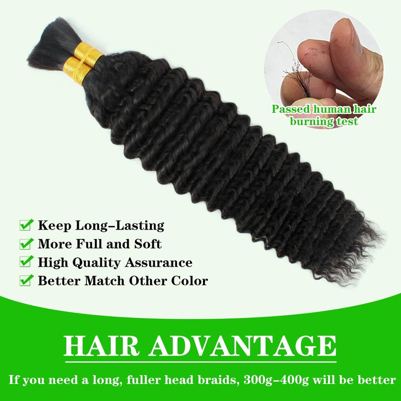 - The material of bulk human hair: The deep wave bulk human hair no weft is made of 100% unprocessed Brazilian virgin human hair, cut from single young healthy woman, bouncy and glossy.