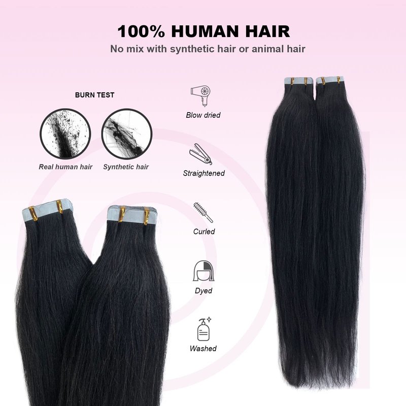- [100% HUMAN HAIR EXTENSION]: OiMiGO Yaki Straight tape in hair extensions are made from raw materials donated by healthy donors, no mixed animal or synthetic hair, soft and elastic, easy to clean and manage, not easy to tangle, can be straightened, dyed or washed, easily change your style without hurting your hair. Note: ①Comb curly hair extensions with fingers or a wide tooth comb.②Heating temperature should not exceed 180°C.