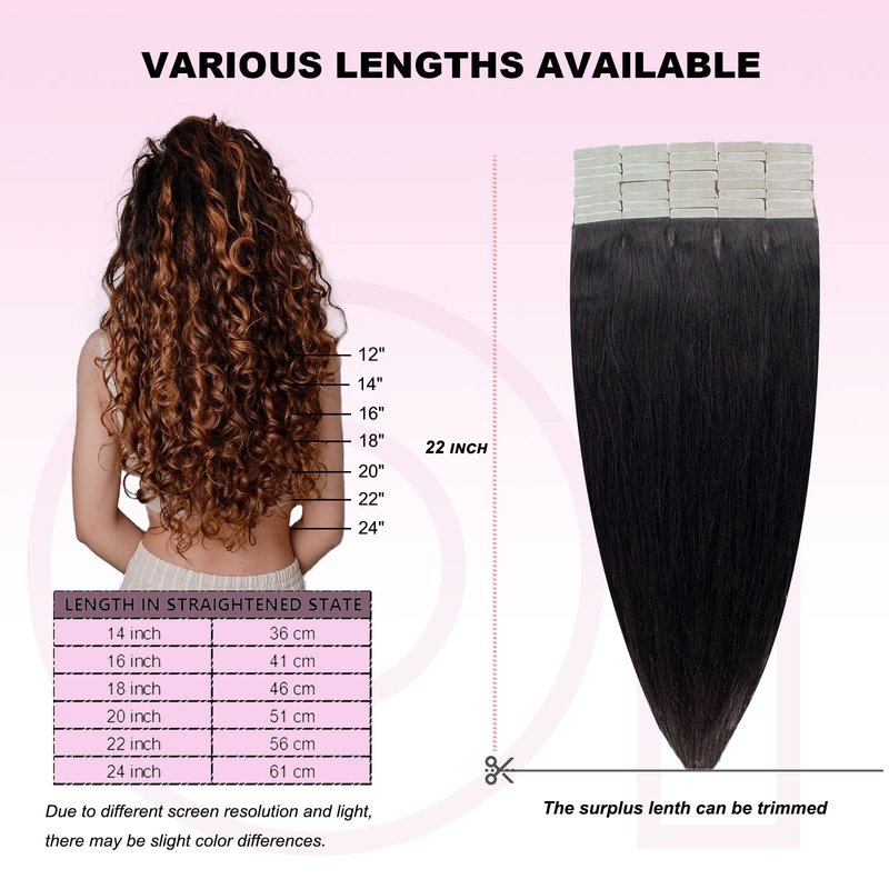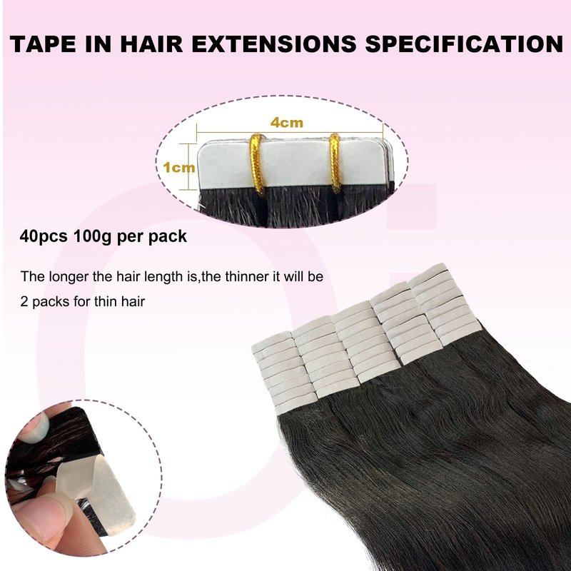 - [TAPE INS SPECIFICATIONS]: 6 different lengths and many colours to choose from, 14" / 16" / 18" / 20" / 22" / 24", 40 pieces per pack of 100g, 4cm width, 1cm high tape. If you like thick hair or you want to lengthen your hair, 2 to 3 sets are recommended to avoid thinning of the ends.