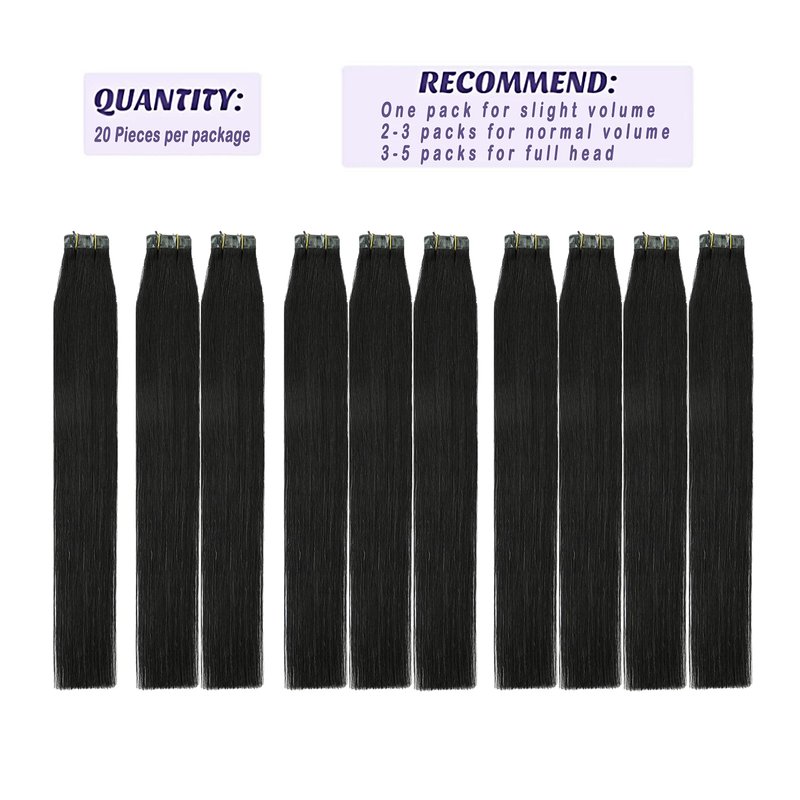 Our products are high-quality 8A human hair in packs of 20. It is seamless straight, and a natural wave after washing is normal. We have our factory and brand, so we can offer you the best price. Remy human hair extension with adhesive tape. Remy hair extension with color Jet black, dark brown, natural black, and platinum blonde, which can be dyed. Our tape is high-strength hypoallergenic invisible tape as well as very sticky.