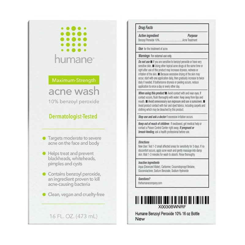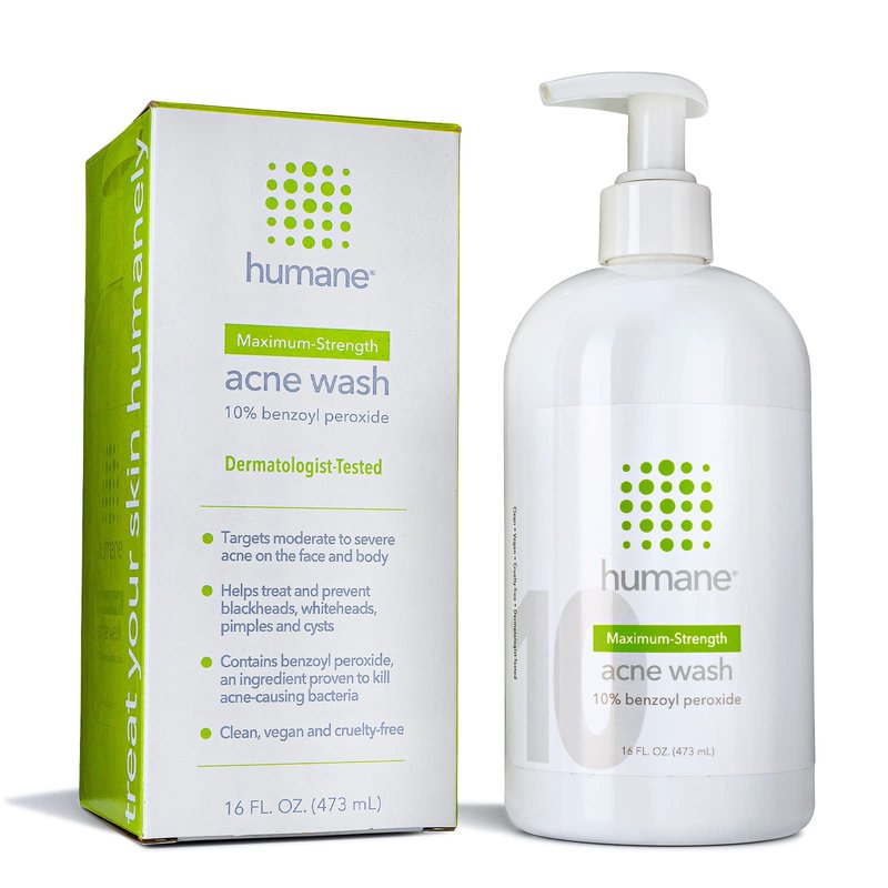 - Maximum-Strength Acne Treatment Wash: Formulated with 10% benzoyl peroxide, Humane Maximum- Strength Acne Wash is a potent face and body cleansing treatment that targets the primary cause of acne growth and combats excessive oil production. Helps to unclog pores, reduce inflammation and clear skin. Dermatologist-tested. 16 FL. OZ. bottle