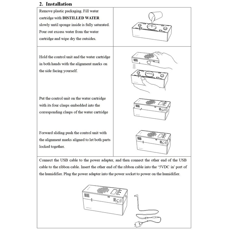 How to install the humidifier?Fill cartridge with DISTILLED WATER until sponge is saturated. Pour out excess water from cartridge. Push the control unit until it clicks into place with alignment marks are aligned.