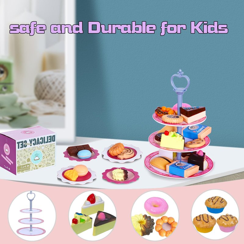 - Super Value Tea Set for Little Girls - 30 PCS pretend dessert food set include 1 gift box, 3-tiered cake stand(made of 7 pieces), 4 plates , 2 forks, 1 cake shovel, 1 cake tongs, 2 pastry box, 19 sweet treats (doughnut, cakes, cookies etc). Rich pretend tea dessert accessories, let your little girls endless hours of tea time themed pretend role play.