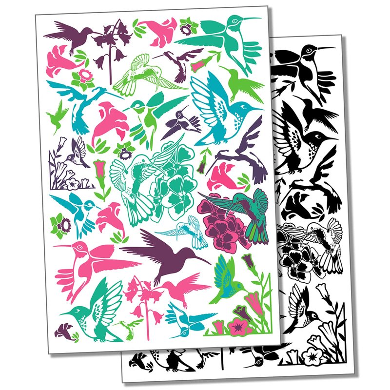 Hummingbirds and Flowers Temporary Tattoo Water Resistant Fake Body Art Set Collection - Black (One Sheet)