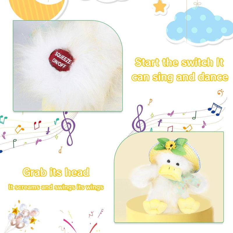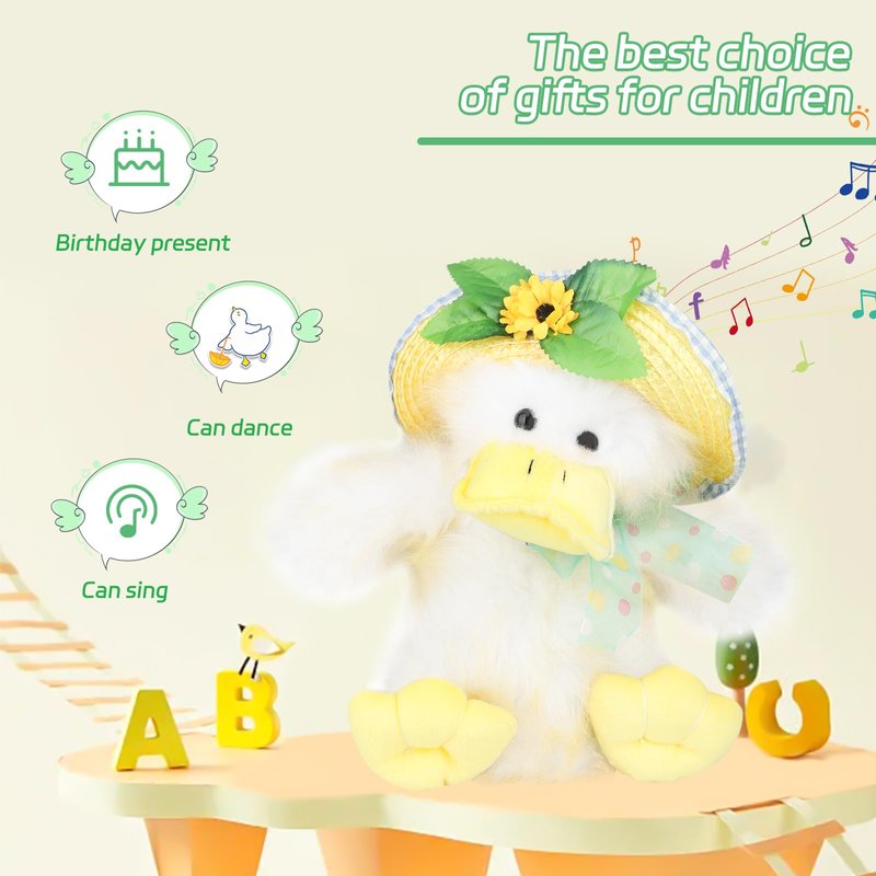 - 【Features of the toy:】 In addition to its novel design, the duck is made of fabric using various techniques to look more upscale. The pleasant music combined with the cute actions makes it more appealing to children.