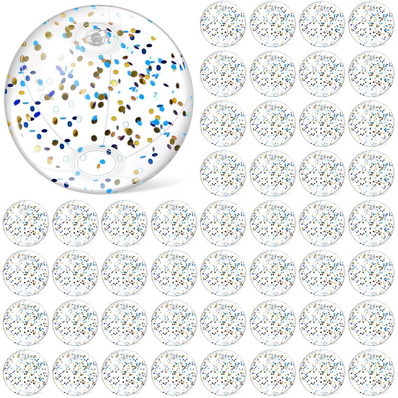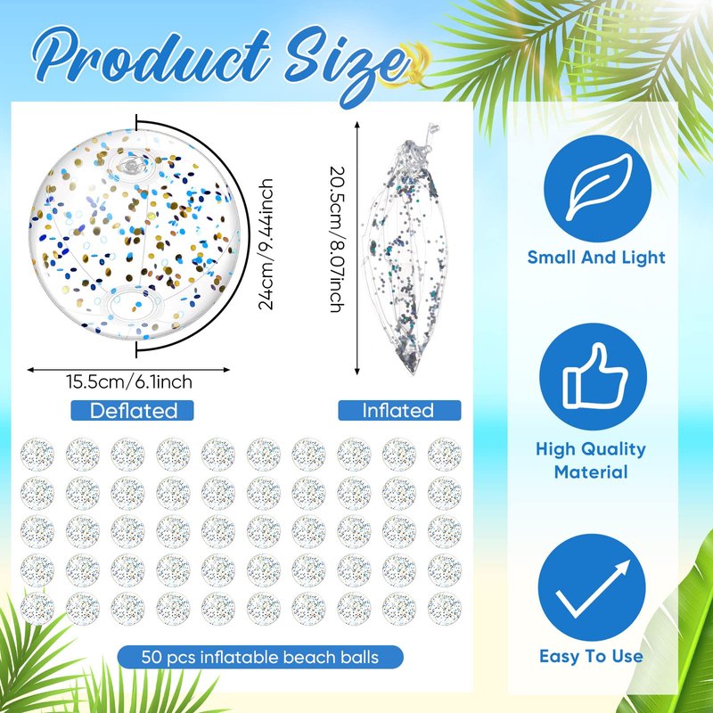 Features: Shiny inner confetti: The inside of the mini summer balls is filled with colorful confetti, thus you only need to tap it lightly before use to make the confetti disperse, and you can get a novel and interesting beach ball. Funny summer toys: Make your summer more fun with these confetti swim balls for pool. You can play with your family during your beach vacation or pool party. They are suitable for gym class, outdoor activities and so on. Specifications: Material: PVC Main color: silver Size: about 8 inches before inflation and about 6 inches after inflation Package includes: 50 x Small inflatable beach balls Notes: Manual measurement, please allow slight errors on size. The color may exist a slight difference due to different screen displays.