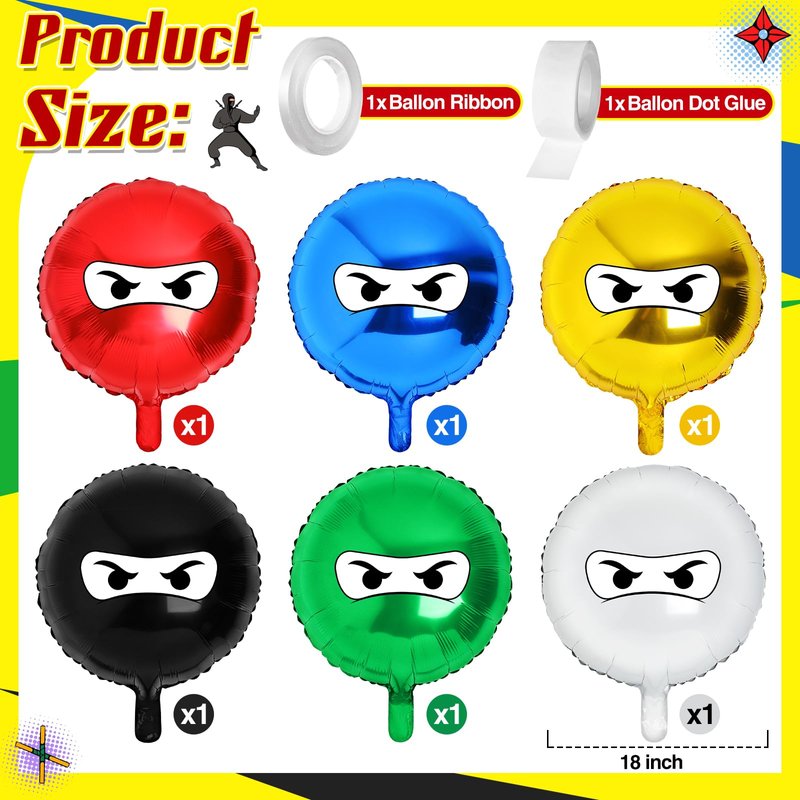 - Ninja Theme Party Decoration: ninja balloon set includes 6 colors of aluminum film balloons: red, black, blue, green, yellow and white; The size of the aluminum film balloon is 18 inches, 1 roll of balloon adhesive, 1 roll of white ribbon