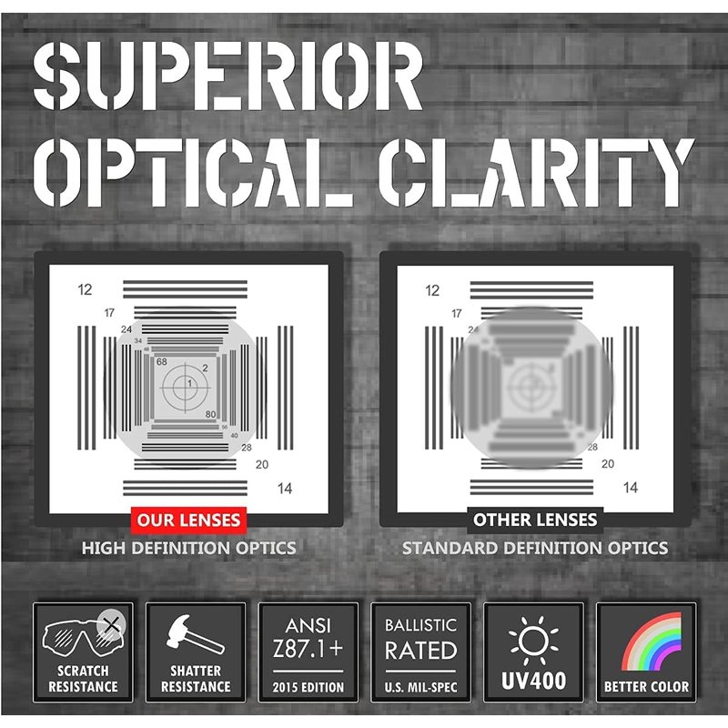 - 【Military-Grade Protection】ANSI Z87.1+ compliant, OSHA approved, in-house lab simulation tests meet CSA Z94.3 and withstand the U.S. standard MIL-PRF-32432A 4.8.4 ballistic impact velocity exceeded 725 ft/s. The hexagon shape on the frame front symbolizes the exceptionally mechanical strength of the honeycomb structure that gives your eyes the ultimate protection.
