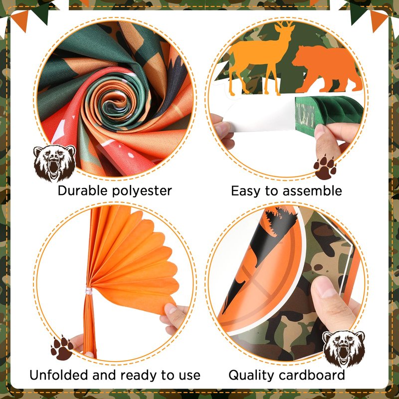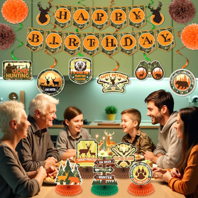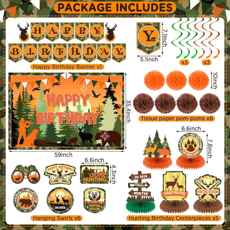 - Package Includes: The hunting birthday decorations kit includes 1 pc deer hunting birthday banner, 1 pc camo birthday bunting banner, 5 pcs hunting honeycomb centerpieces, 6 pcs gone hunting hanging swirls, and 6 pcs orange and brown tissue paper pom poms, which are enough to decorate your and your family hunting birthday party