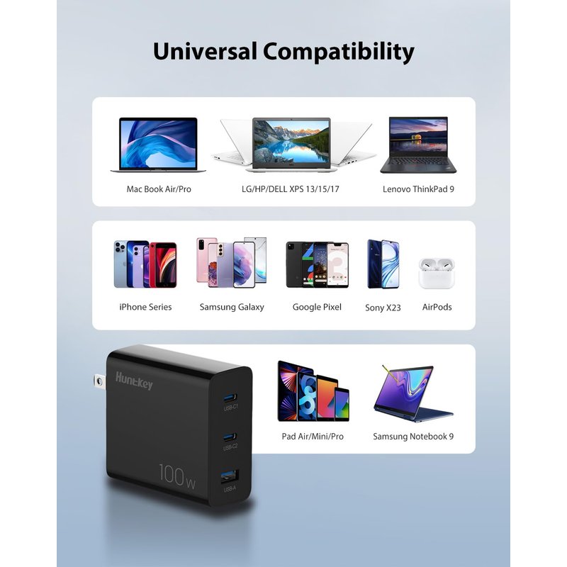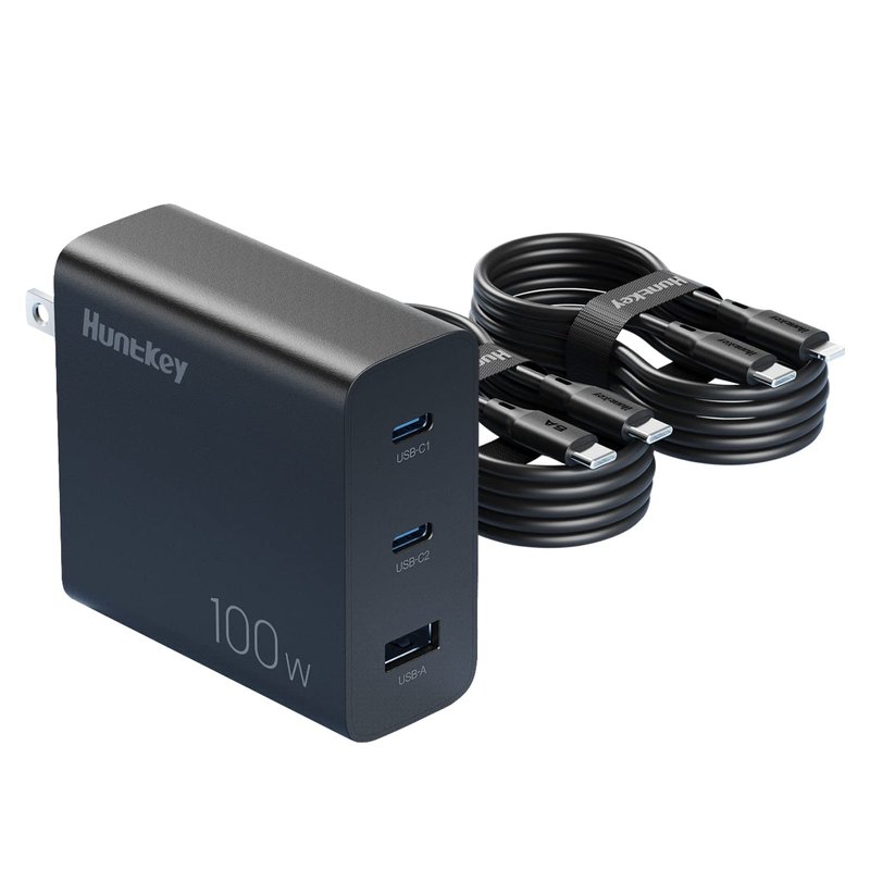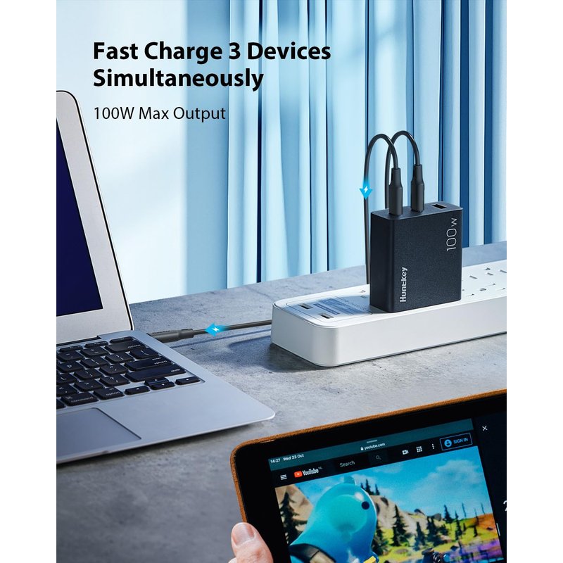 Huntkey 100W USB C Charger with 2-Pack USB C Cable, 3-Port GaN PD Fast Power Adapter USB C Wall Charger Block for MacBook Pro/Air, Dell XPS, iPad, iPhone 14/14 Pro /13/13 Pro, Galaxy S23/S22/S21