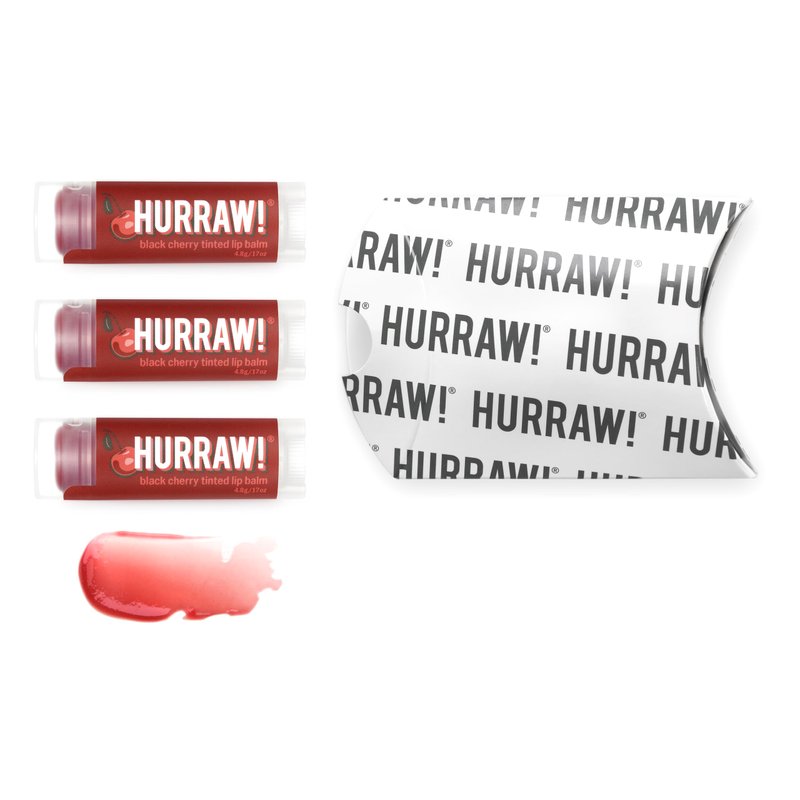 - THREE 4.8g/.17oz Oval Tubes of Black Cherry Tinted Lip Balm packaged in a white HURRAW! branded pillow box. A gorgeous RED SHEER TINT is included for your kissers on this balm! The perfect everyday balm for a subtly enhanced natural look. All natural organic flavor makes it tart and yum …mmm! Made with certified organic, vegan, and raw ingredients. Hurraw! Lip Balms are certified 100% all natural origin, cruelty and gluten free. Non-GMO. Bee, Shea, Soy and Palm Free.