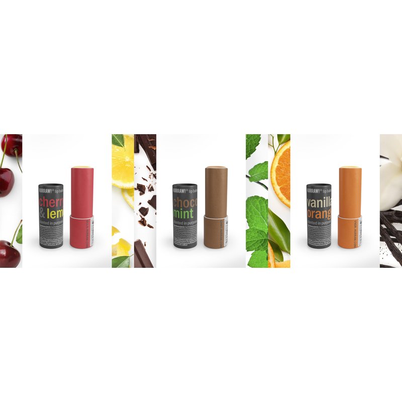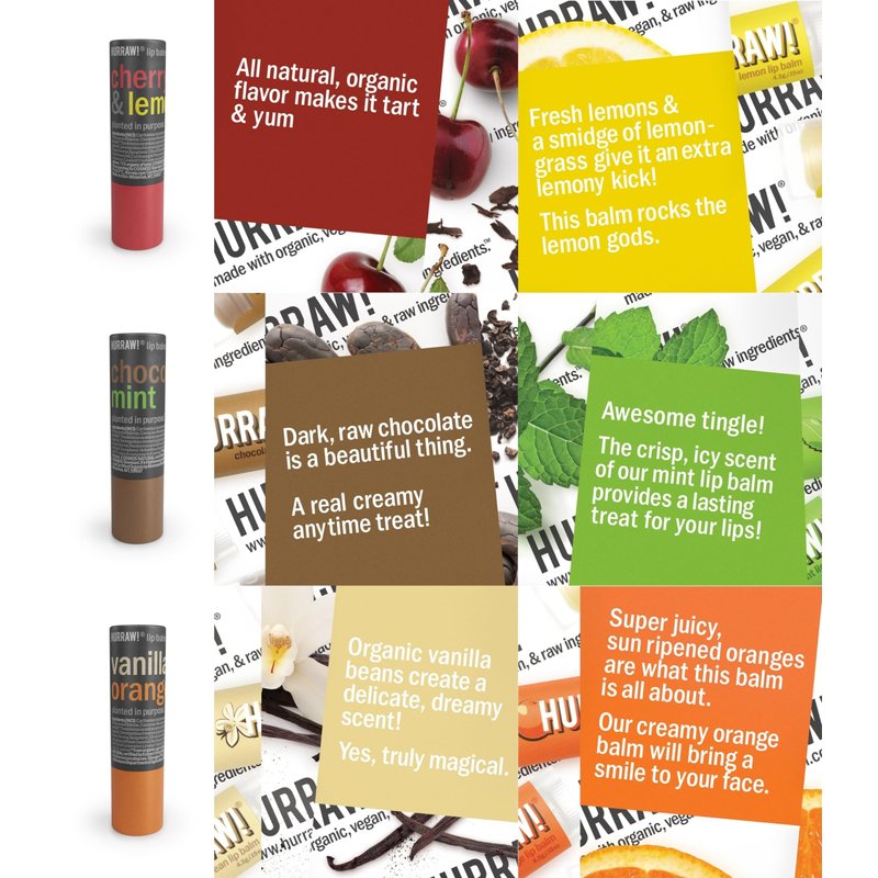 - THREE 4.8g/.17oz Round Cardboard Tubes of HURRAW! Lip Balms packaged in a white HURRAW! branded pillow box. Cherry Lemon, Chocolate Mint and Vanilla Orange: Now in a PLASTIC-FREE cardboard applicator format. Yes …. We can save our EARTH! Made with certified organic, vegan, and raw ingredients. Hurraw! Lip Balms are certified 100% all natural origin, cruelty and gluten free. Non-GMO. Bee, Shea, Soy and Palm Free.