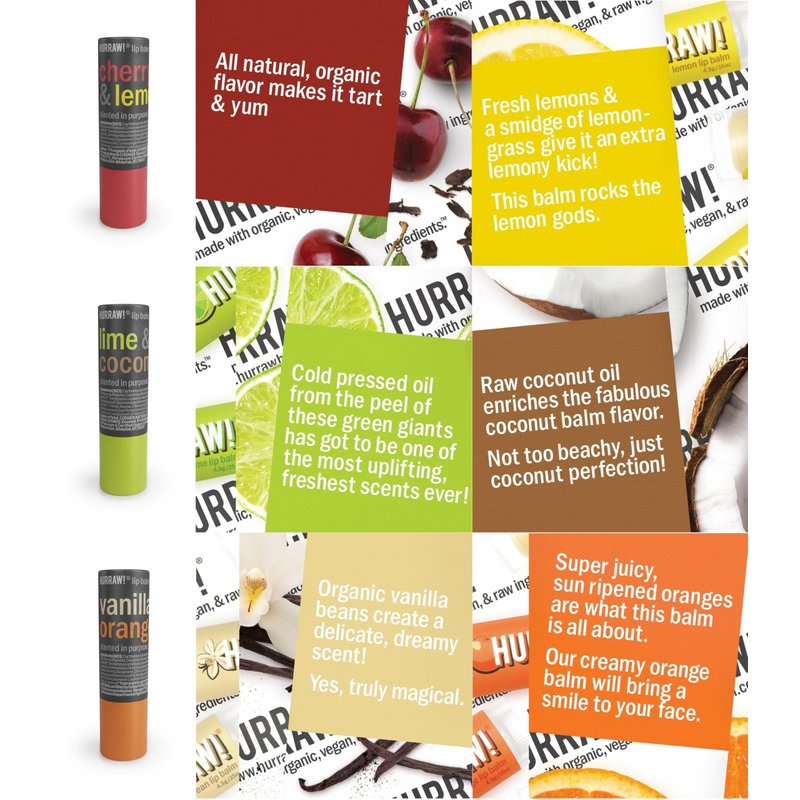 - THREE 4.8g/.17oz Round Cardboard Tubes of HURRAW! Lip Balms packaged in a white HURRAW! branded pillow box. Cherry Lemon, Lime Coconut and Vanilla Orange: Now in a PLASTIC-FREE cardboard applicator format. Yes …. We can save our EARTH! Made with certified organic, vegan, and raw ingredients. Hurraw! Lip Balms are certified 100% all natural origin, cruelty and gluten free. Non-GMO. Bee, Shea, Soy and Palm Free.