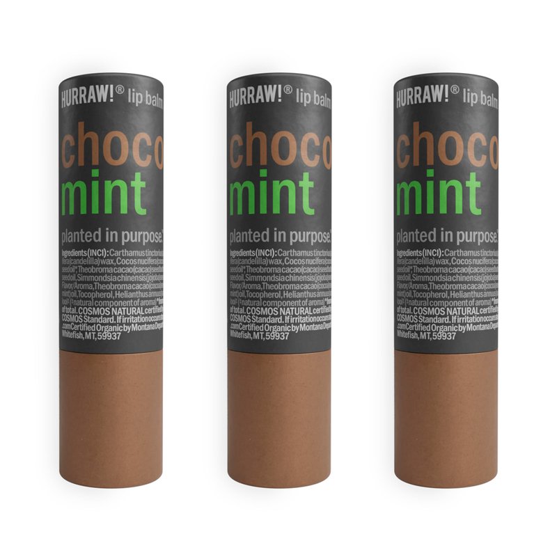 - THREE 4.8g/.17oz Round Cardboard Tubes of HURRAW! Chocolate and Mint Lip Balm packaged in a white HURRAW! branded pillow box: Now in a PLASTIC-FREE cardboard applicator format. Yes …. We can save our EARTH! Made with certified organic, vegan, and raw ingredients. Hurraw! Lip Balms are certified 100% all natural origin, cruelty and gluten free. Non-GMO. Bee, Shea, Soy and Palm Free.