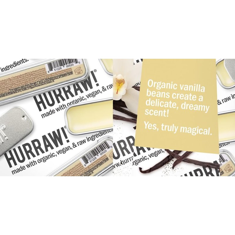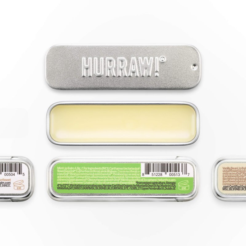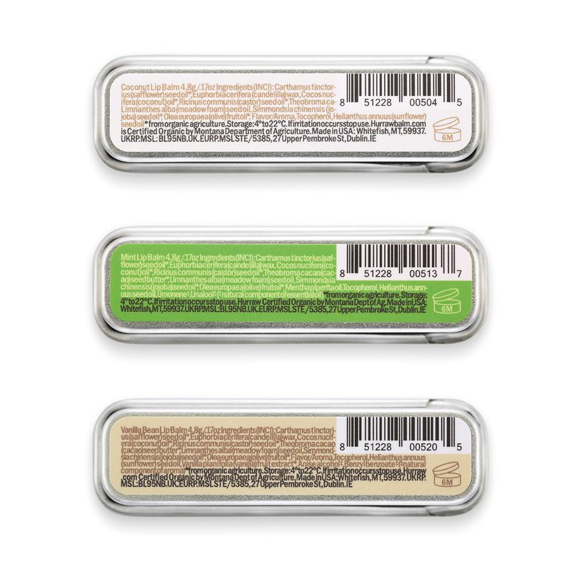 - THREE Slim Slider Tins of HURRAW! Lip Balm packaged in a white HURRAW! branded pillow box. COCONUT Lip Balm (Rich, raw coconut oil enriches the fabulous flavor of this balm. Not too beachy, a little toasty... coconut perfection.) MINT Lip Balm (Awesome tingle and crisp that provides a long lasting minty treat for your lips!) VANILLA BEAN Lip Balm (The tiny speck, vanilla bean seed lingers. You might even find one! A delicate, dreamy vanilla scent.) A Luxury Lip Balm MADE IN THE USA.