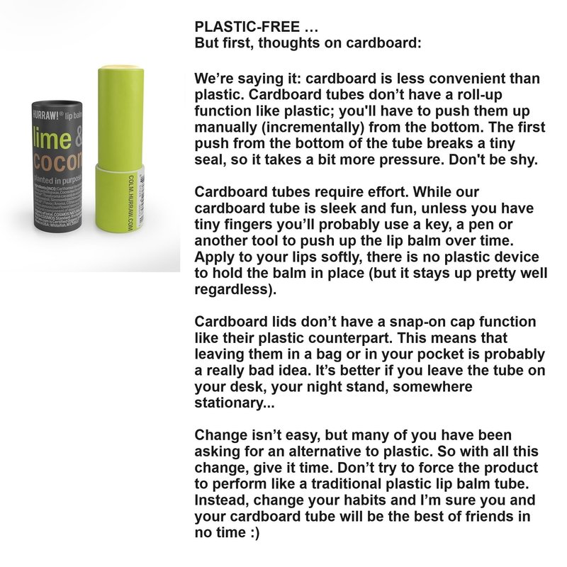 - THOUGHTS ON PLASTIC FREE: Cardboard tubes require effort. We’re saying it: cardboard is less convenient than plastic. Cardboard tubes don’t have a roll-up function like plastic; you'll have to push them up manually. Cardboard lids don’t have a snap-on cap function like their plastic counterpart. This means that leaving them in a bag or in your pocket is probably a bad idea. Change isn’t easy, but many of you have been asking for an alternative to plastic. Don’t try to force the product to perform like a traditional plastic lip balm tube. Instead, change your habits and help save our Earth :)