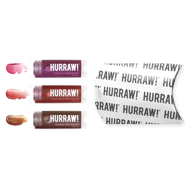 - THREE 4.8g/.17oz Oval Tubes of HURRAW! Lip Balm packaged in a white HURRAW! branded pillow box. RASPBERRY gives a SHEER BERRY TINT and bestowed with a tart, delectable raspberry flavor. BLACK CHERRY, gives a gorgeous SHEER RED TINT included for your kissers on this balm! HAZELNUT, offers a SHEER SUNSET BROWN TINT. Made with certified organic, vegan, and raw ingredients. Hurraw! Lip Balms are certified 100% all natural origin, cruelty and gluten free. Non-GMO. Bee, Shea, Soy and Palm Free.