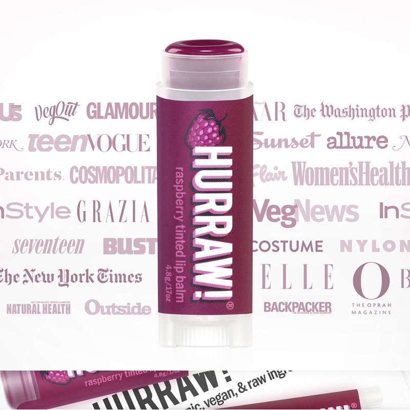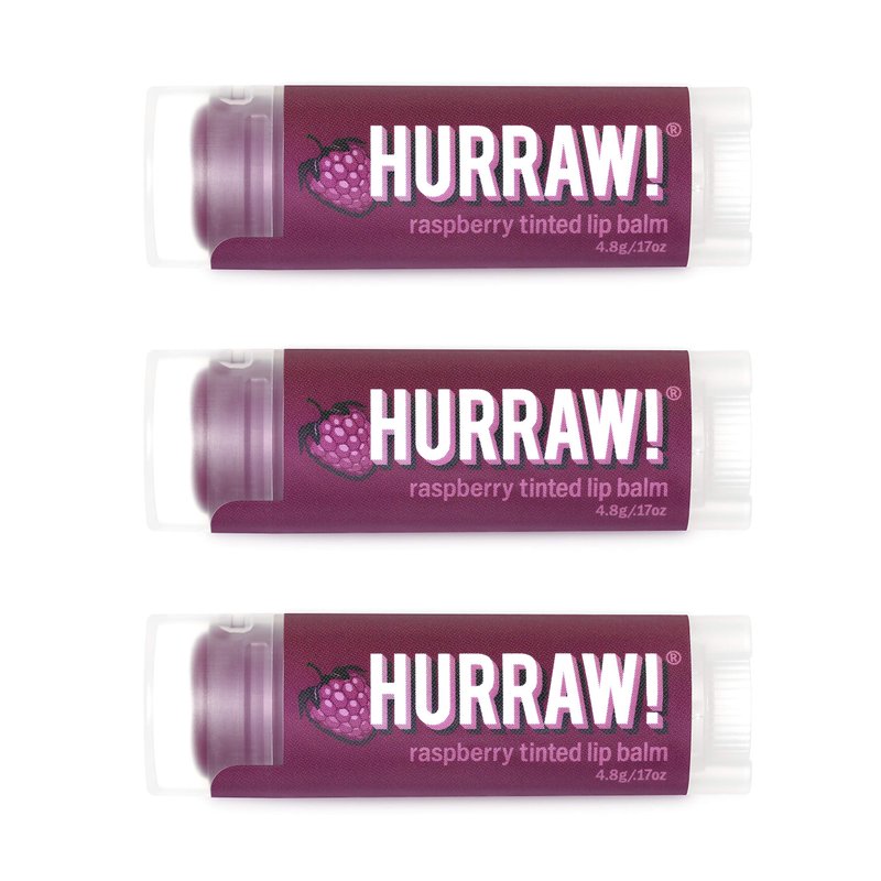 - THREE 4.8g/.17oz Oval Tubes of Raspberry Tinted Lip Balm packaged in a white HURRAW! branded pillow box. Let’s talk carrots. Purple carrots! That tints your lips with a SHEER BERRY hue. Bestowed with a tart, delectable raspberry flavor. You’re welcome! Made with certified organic, vegan, and raw ingredients. Hurraw! Lip Balms are certified 100% all natural origin, cruelty and gluten free. Non-GMO. Bee, Shea, Soy and Palm Free.