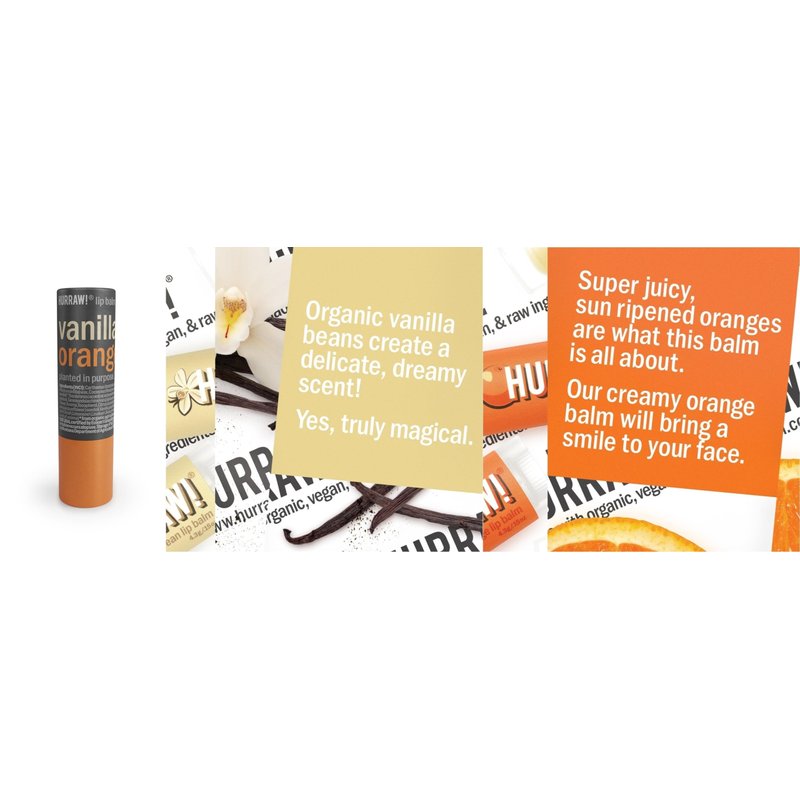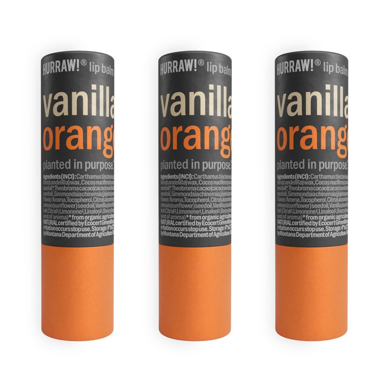 - THREE 4.8g/.17oz Round Cardboard Tubes of HURRAW! Vanilla and Orange Lip Balm packaged in a white HURRAW! branded pillow box: Now in a PLASTIC-FREE cardboard applicator format. Yes …. We can save our EARTH! Made with certified organic, vegan, and raw ingredients. Hurraw! Lip Balms are certified 100% all natural origin, cruelty and gluten free. Non-GMO. Bee, Shea, Soy and Palm Free.