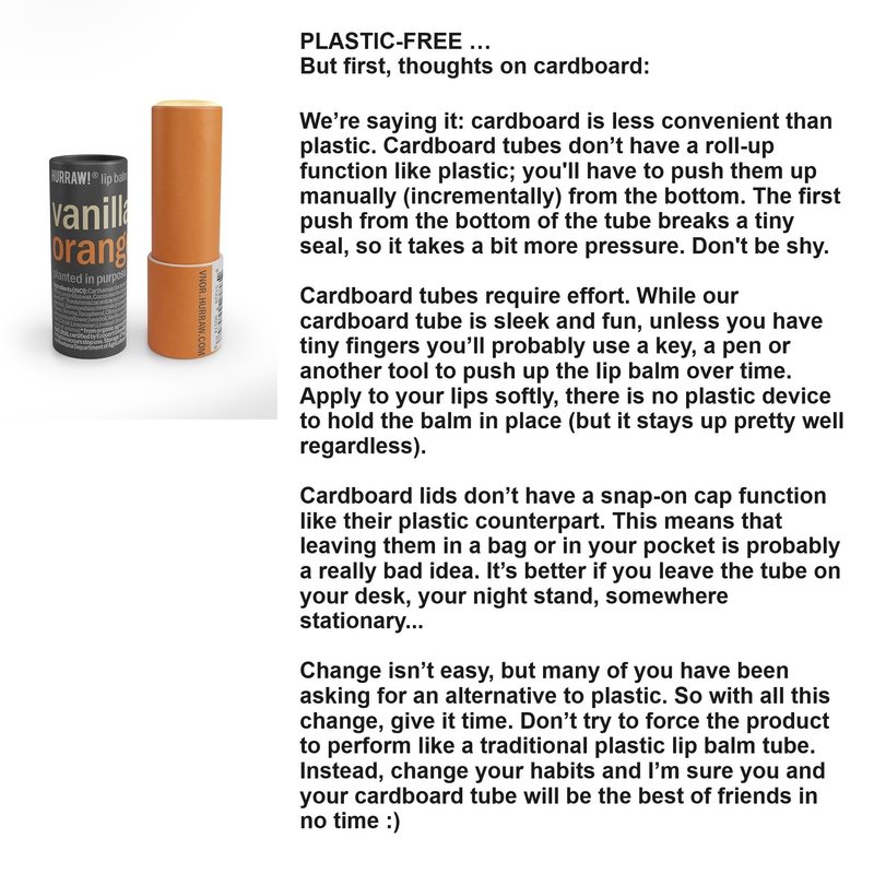 - THOUGHTS ON PLASTIC FREE: Cardboard tubes require effort. We’re saying it: cardboard is less convenient than plastic. Cardboard tubes don’t have a roll-up function like plastic; you'll have to push them up manually. Cardboard lids don’t have a snap-on cap function like their plastic counterpart. This means that leaving them in a bag or in your pocket is probably a bad idea. Change isn’t easy, but many of you have been asking for an alternative to plastic. Don’t try to force the product to perform like a traditional plastic lip balm tube. Instead, change your habits and help save our Earth :)