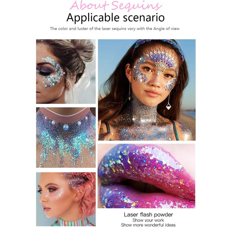 - Multiple Application:The glitter gel can be used on many part of body,ou can put our glitter on your face, body,eyes,hair,arms, and chest to go with mermaid costume,providing you a shiny look.Fit for Concerts, Halloween parties, rave festival accessories or any sort of fun even