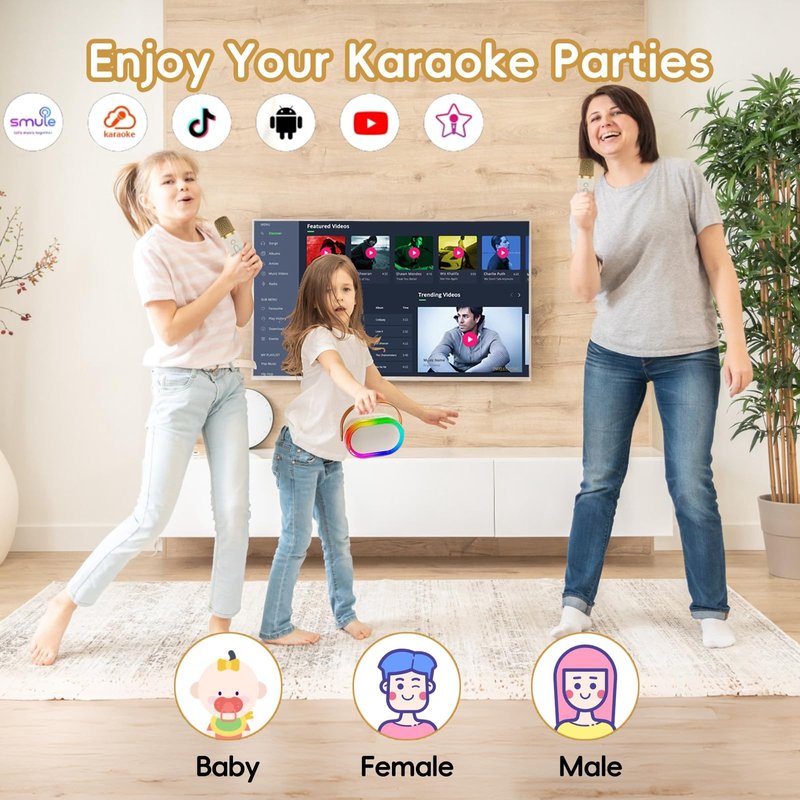 - 【All-in-one Karaoke System】This mini karaoke system includes a karaoke speaker with disco light, 2 wireless microphones with magic sounds, making it an ideal choice for home karaoke,friends gathering or outdoor small parties. It is also a wonderful gift for individuals of all ages in birthdays, holidays, christmas or other occasions.