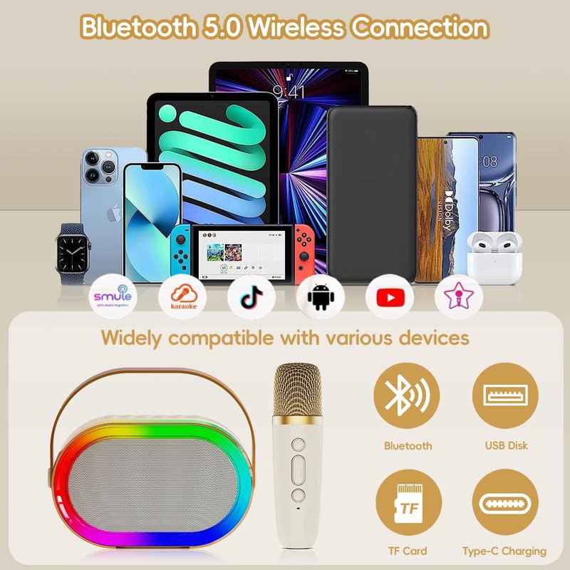 - 【Multiple Connection Options】This mini karaoke machine for adults and kids can seamlessly connect via Bluetooth 5.0, Micro TF cards, USB flash drives, and AUX connections, allowing you to access your music library directly. It is compatible with various devices like phones, iPads, tablets, and PCs, offering flexibility for users of all preferences.