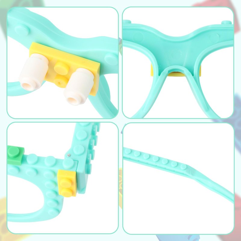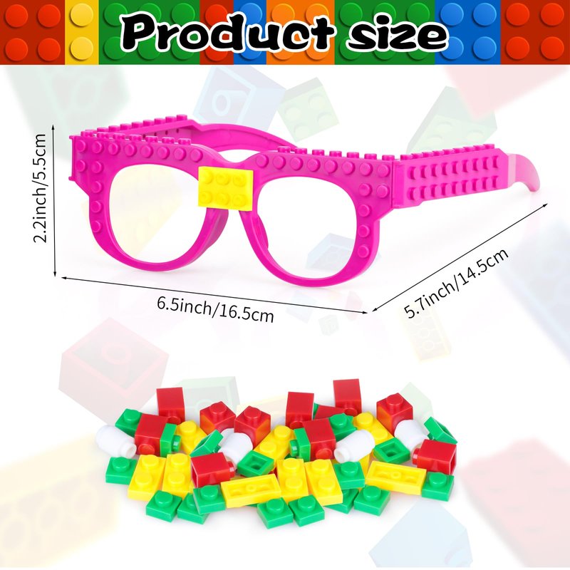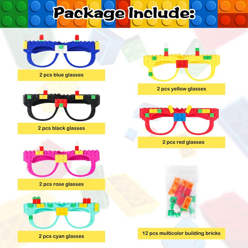 - Building Bricks Glasses Set Includes: 12pcs glasses frame of various colors, 2 yellow, 2 red, 2 cyan, 2 rose red, 2 blue and 2 black, and 12 packets of colored building bricks, interesting and unique design of glasses are very popular with kids.