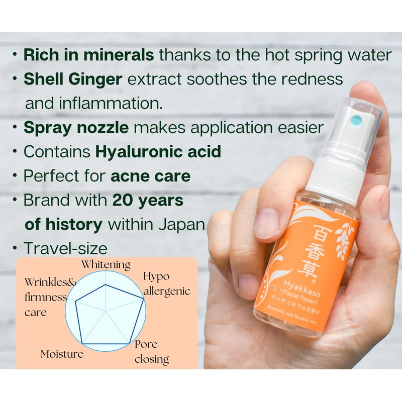 - 【TONER】is made with carefully selected natural Shell Ginger, Hyaluronic Acid, Lemon juice and hot spring water (ONSEN). Drawn from 1,600 meters underground in the Gifu prefecture, famous for its hot spring resorts, onsen water is rich in minerals. Hyakkaso Toner helps to improve the elasticity of skin and restores the damage caused by sunburn. Keeps skin hydrated thanks to the hyaluronic acid's properties. Shell Ginger extract has a nice astringent effect. For a natural and healthy skin.
