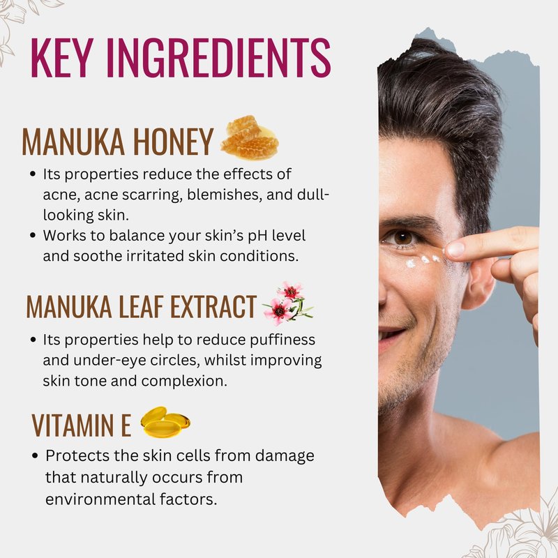 - REAL, NATURAL RESULTS WITH THE POWER OF HYALURONIC ACID & VITAMIN E. In the super-concentrated formula, naturally occurring Hyaluronic Acid replenishes your skin, leaving it bright, smooth, and lifted. Pure New Zealand Manuka Honey, Hyaluronic Acid, Vitamin E and Eye Bright Extract, Natural Plat Extract provide deep hydration and prevent further damage from the sun and environment.