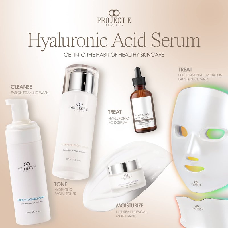 Boost your skin’s moisture content with Project E Beauty’s non-greasy Hyaluronic Acid Serum.