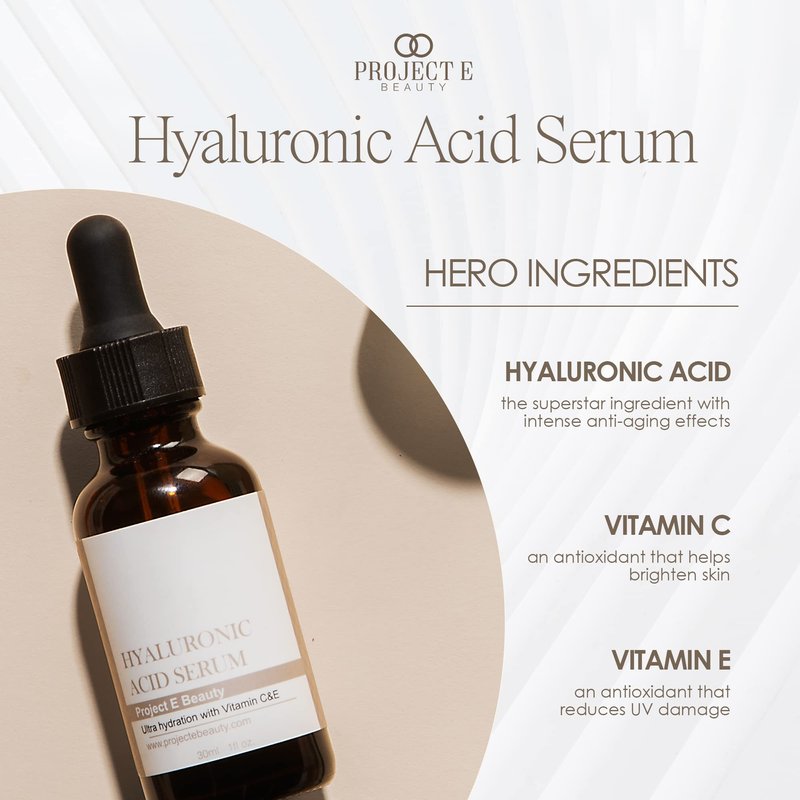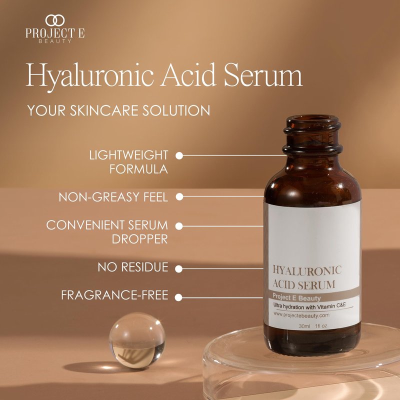 - 💧 INTENSE MOISTURE & HYDRATION - Supplement your anti-aging skin routine with Project E Beauty’s Hyaluronic Acid Serum. Protect your skin from dehydration - hyaluronic acid binds with water to help retain skin’s moisture. Properly hydrated skin helps maintain that youthful and radiant look.