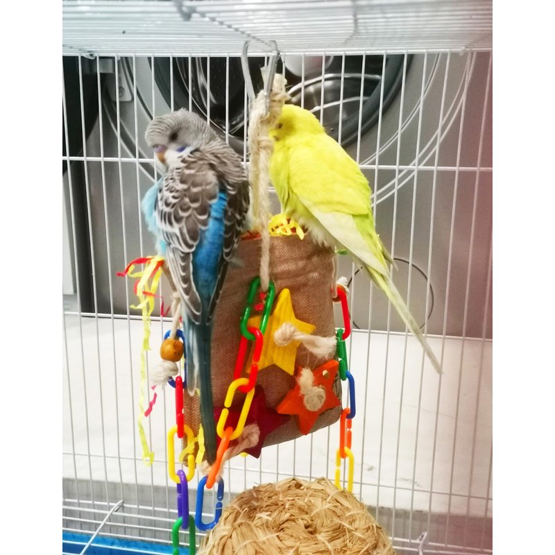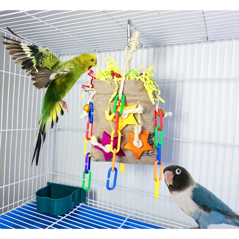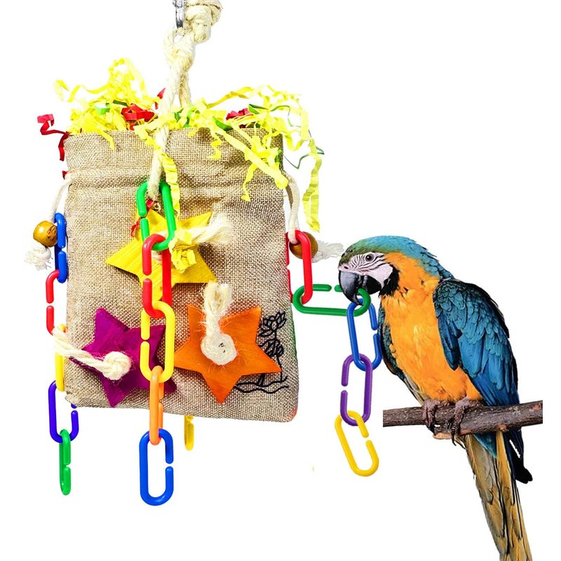 - 【Unique design】This is a lucky bag designed for small and medium sized parrots. It is crafted with a fantastic combination of natural toy parts stuffed into a gunny bags, Your pet birds will enjoy the wide variety of crunchy textures, colors, shapes and materials including shredded paper, wooden blocks, chain link and so on.